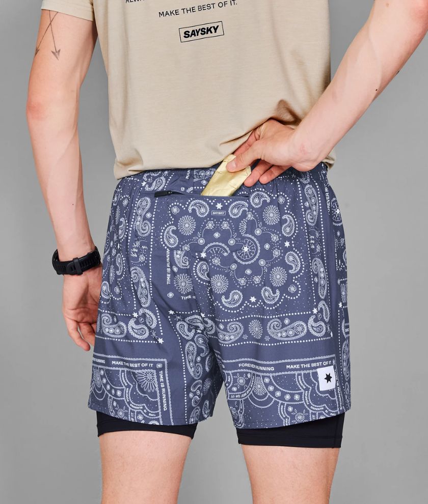The Paisley Pace 2 in 1 Shorts 5’’ are our popular shorts featuring an all-over Saysky paisley pattern. They have a woven SAYSKY label on the front and a SAYSKY logo on the back. The fit is regular with narrow legs to reduce wavering when going really fast. This style is also ideal for trail running.