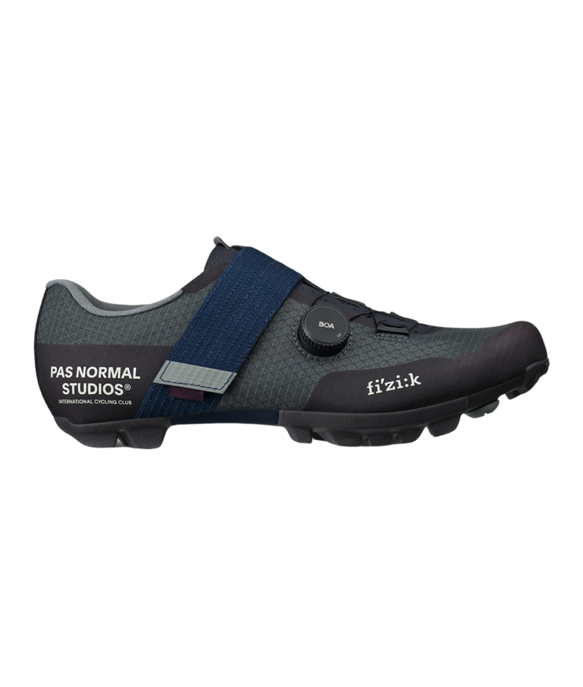 Pas Normal Studios x Fizik Ferox Carbon gravel cycling shoe. Fusing the Italian craftsmanship and innovation of Fizik with the technical and contemporary take on cycling infused in the Pas Normal Studios brand. The Ferox Carbon shoe showcases technological advancements while still referencing functionality and features of the past. Perfect for gravel and other off-road adventures. The shoe offers all-day comfort, stability and adjustability for a secure and completely customised fit.
