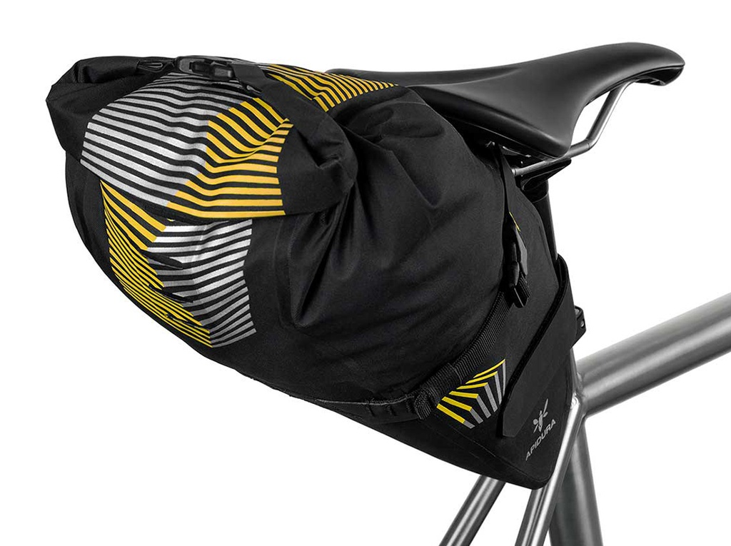 Constructed from an ultralight, waterproof laminate developed for Apidura. The seat bag weighs less than 210g and securely fastens with a sturdy three-point attachment system. It’s designed to fit ergonomically under the saddle, minimising sway and reducing drag.