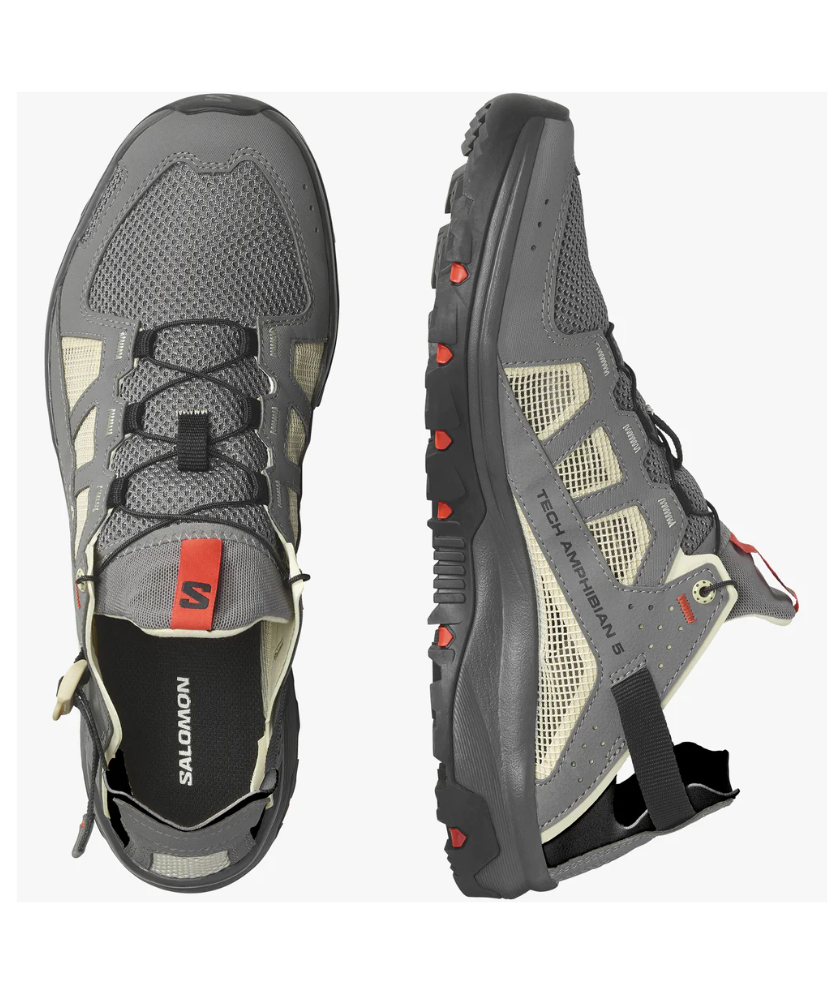 Fully committed to wet and wild exploits, TECHAMPHIBIAN 5’s reinforced toe cap and fully stitched construction will keep your feet protected while its sticky outsole ensures grip on slippery terrain. With a collapsible heel for versatility and ease of use, and quick drying, breathable materials on the upper.