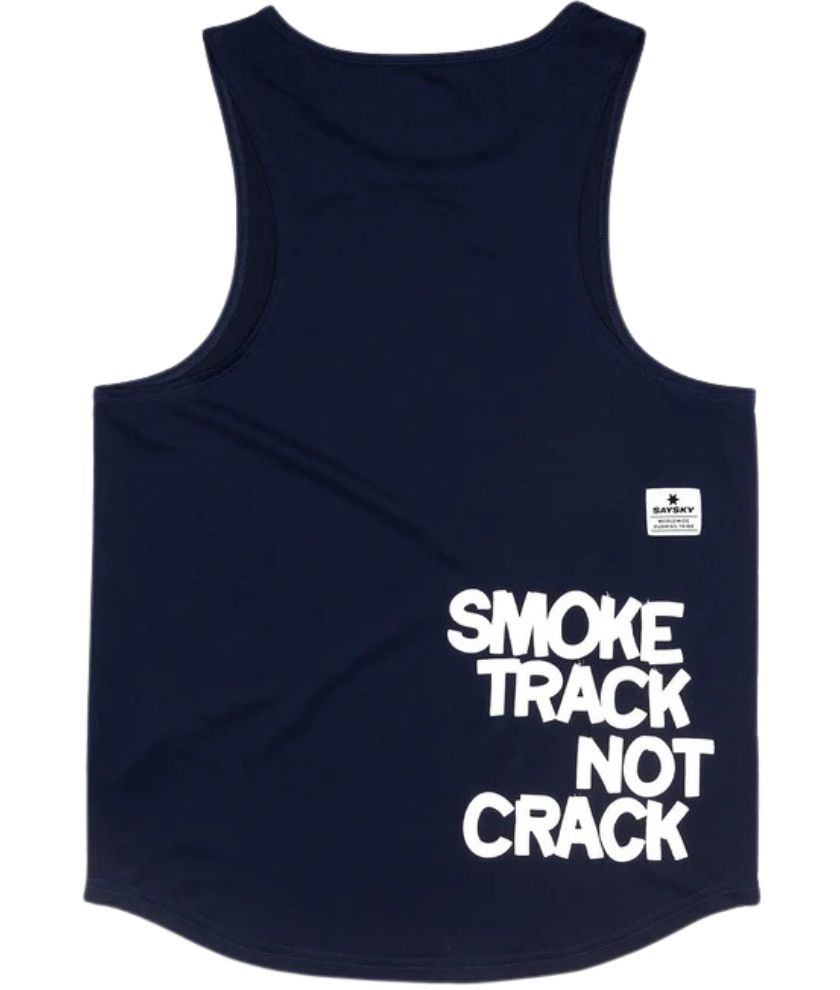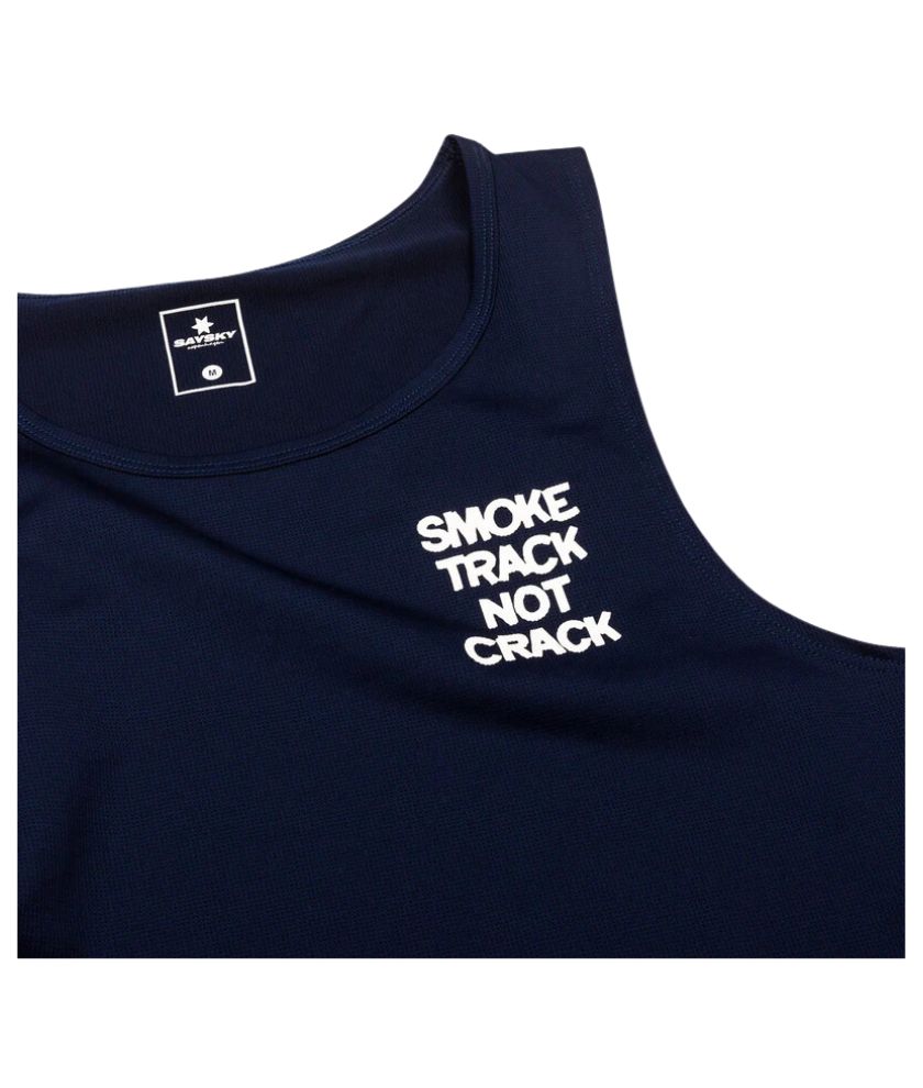SAYSKY's Smoke Track Combat Singlet is a Maritime Blue color race singlet. The chest and back are designed with the "SMOKE TRACK NOT CRACK" statement logo. Made to race specifications with a regular fit. The ultralight and breathable fabric keeps you comfortable while you run.