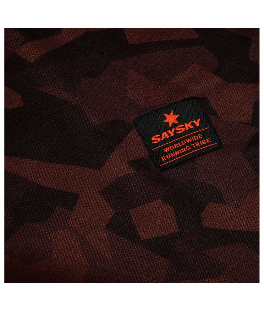 The SAYSKY Splinter Combat Singlet is a unisex race singlet in a burgundy splinter camo print. The fabric is super light and breathable, making for a very comfortable running experience. It comes with a SAYSKY logo on the front and the back. The fit is regular and straight up made for racing.