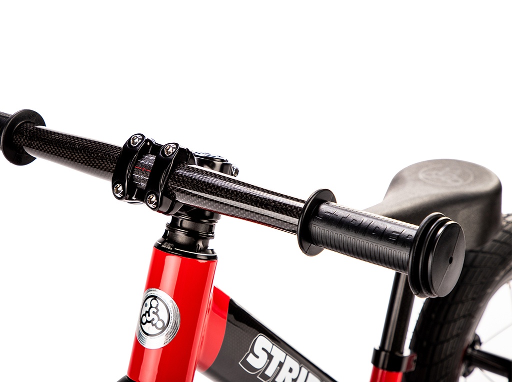 So let’s skip the marketing mumbo jumbo for a minute. Check this out. The Strider ST-R® has a carbon fiber frame with a carbon fiber fork and carbon steerer. The headset is a Cane Creek® AER® with bearings. We also threw in a custom stem, handlebar, grips, and seat clamp. Then, we thought about what else we could add. How about super sticky Schwalbe® “Big Apple” tires? That do anything for ya? Top it off with 10-spoke carbon fiber rims that scream style and custom Strider alloy hubs with cartridge bearings and a thru-axle. The ST-R® is magnificently lean and mean, and there’s no telling what your little one can accomplish when they get into the saddle.