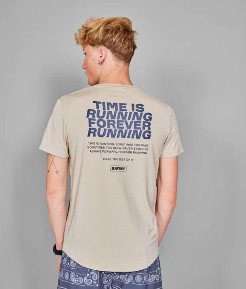 SAYSKY's Statement PACE T-shirt is a short-sleeve running T-shirt for men. It features a SAYSKY logo patch on the front chest and a large statement print on the back. This top is perfect for those looking for a slightly thicker material that is also very soft and sweat-wicking.