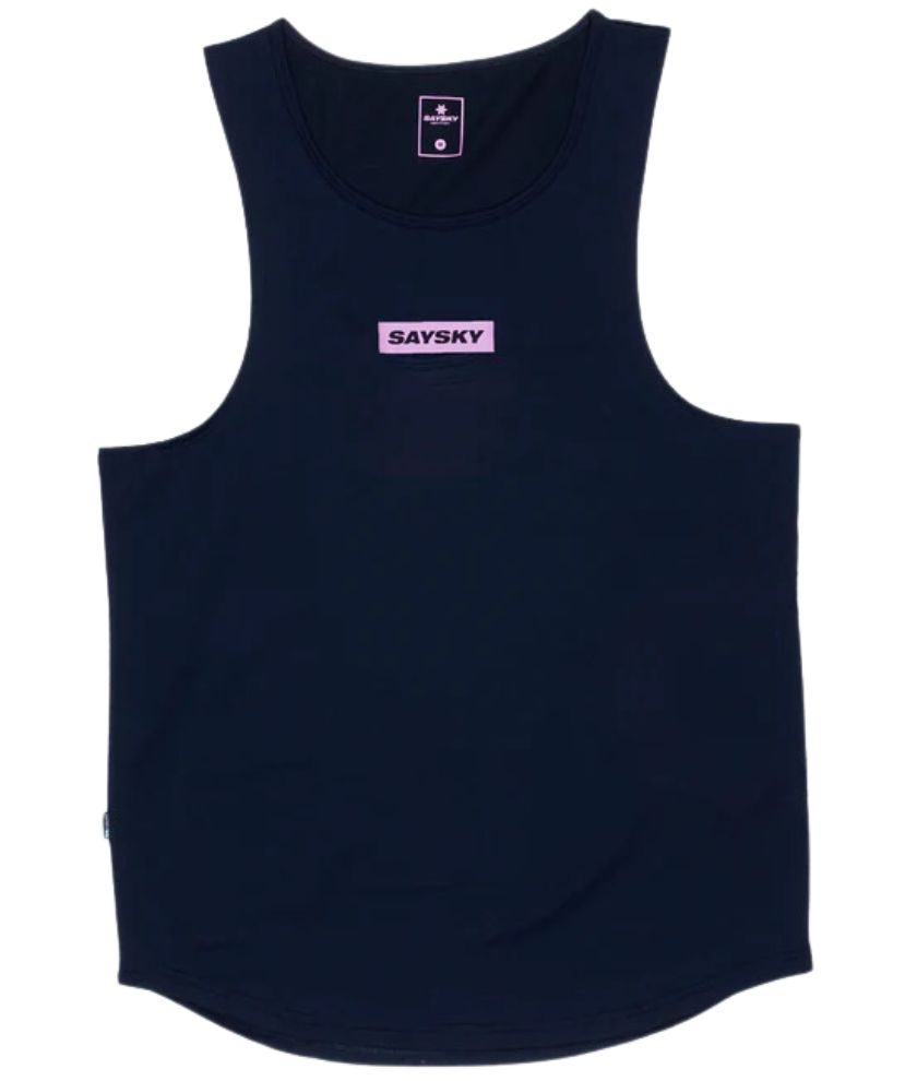The SAYSKY Track Street Combat Singlet is a unisex race singlet in maritime with a purple track print on the back. The fabric is super light and breathable, making for a very comfortable running experience. It comes with a SAYSKY logo on the front and the back. The fit is regular and ideal for both training and racing.