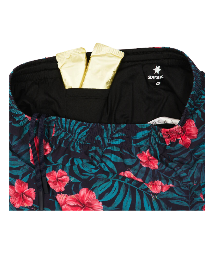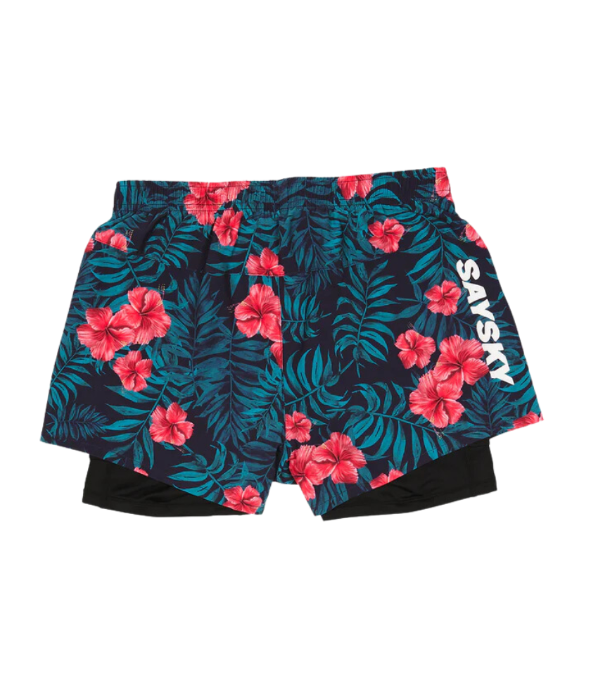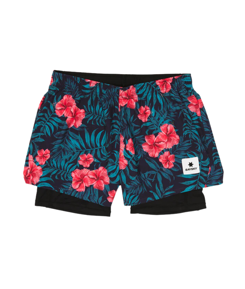 SAYSKY's Women's Flower 2-in-1 Shorts 3 inches are a popular style in the SAYSKY lineup. It has a blooming hibiscus all-over print design and comes with long black inner shorts. There is a white-colored logo patch on the front, and a white-colored SAYSKY logo is printed on the back side. Regular fit design makes it perfect for running, trail running, and at the gym.