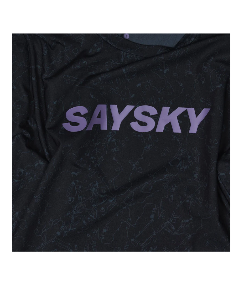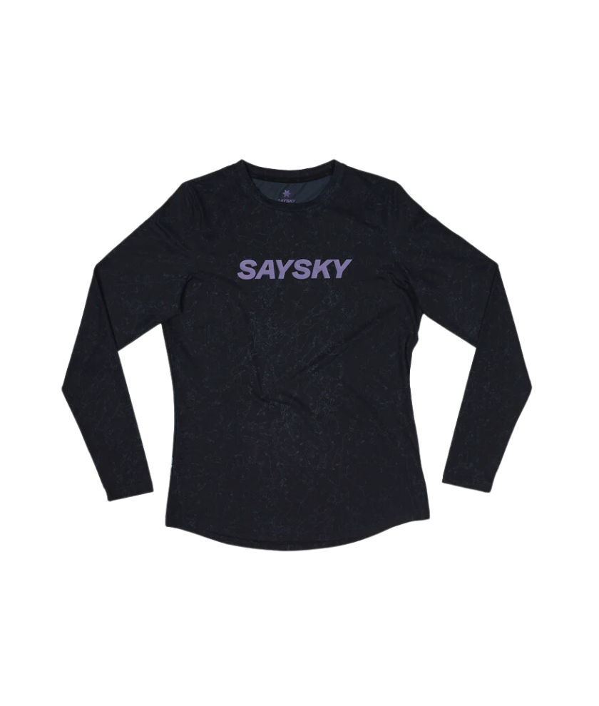 SAYSKY's Women's Map Blaze Long Sleeve is a women's type long sleeve T-shirt for running. The Copenhagen original all-over print design features a purple SAYSKY logo printed on the front chest. A statement logo representing SAYSKY's location is printed on the back side. The regular fit design ensures both comfort and performance while running.