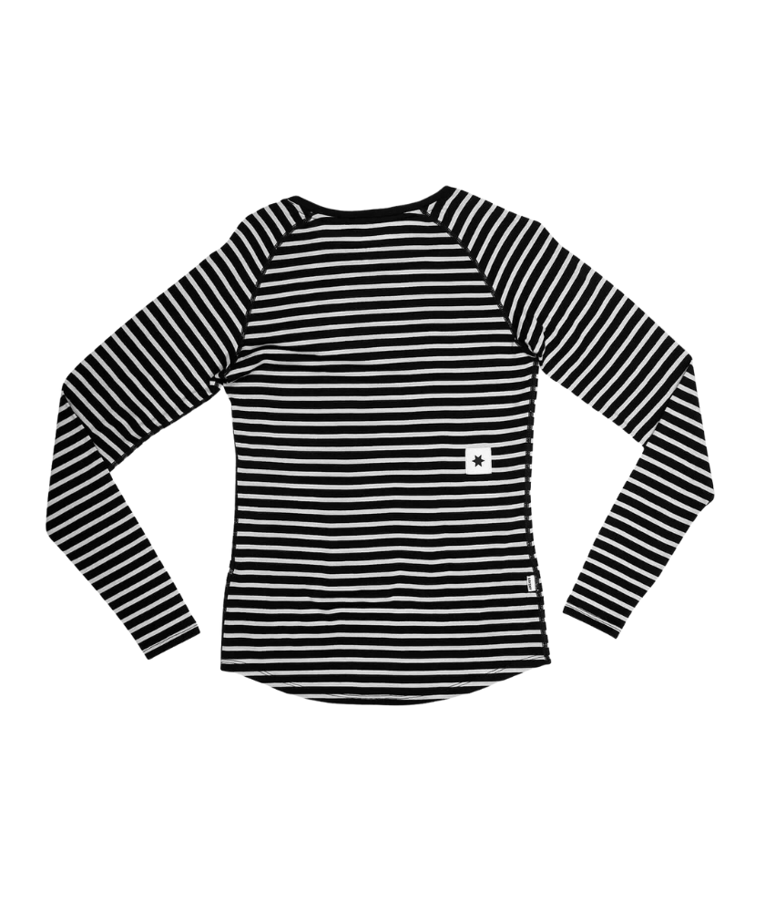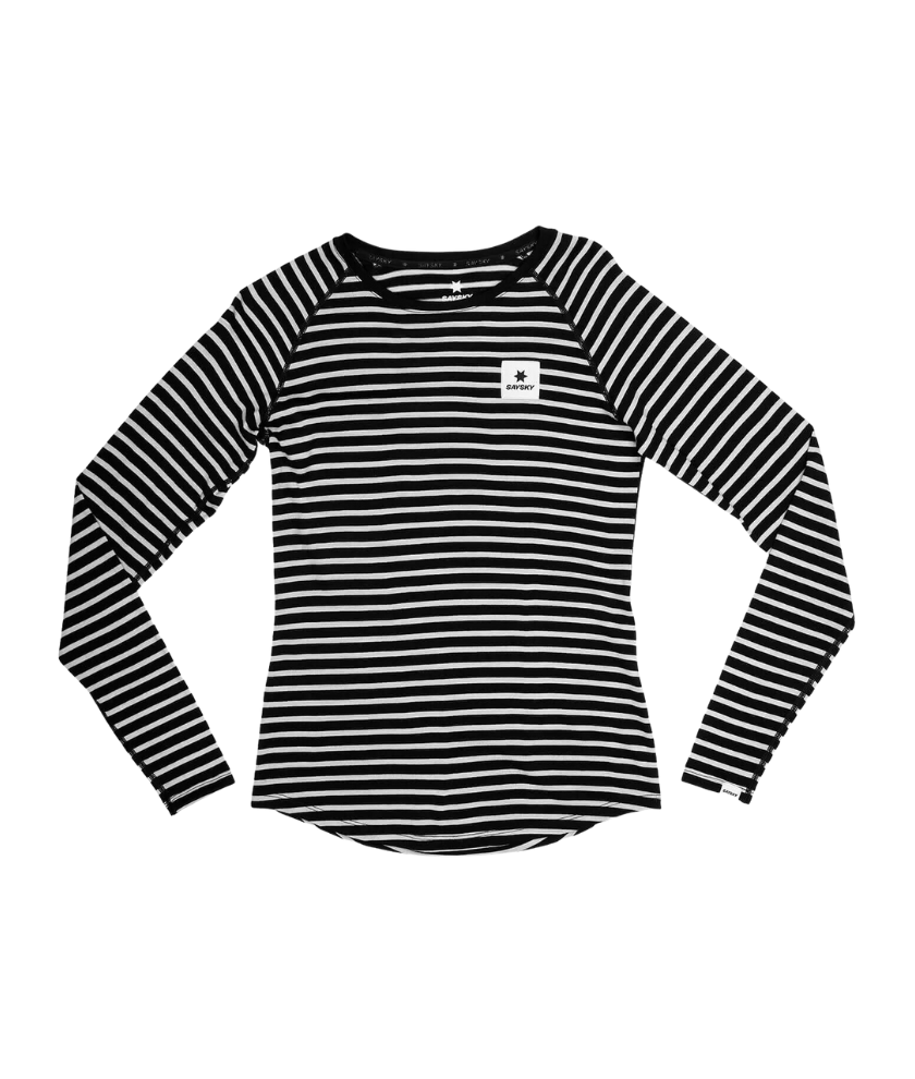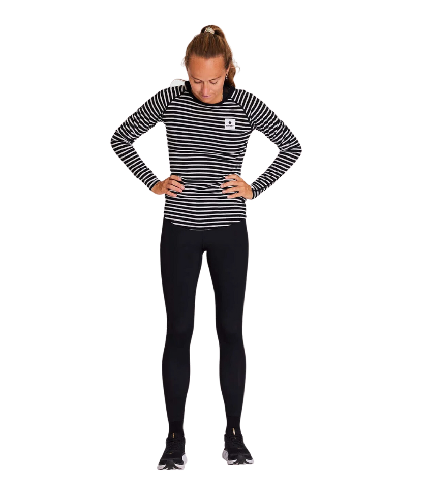 SAYSKY's Women's Striped Merino Base 165 Long Sleeve is a long sleeve running T-shirt made from merino wool that has become one of our favorite cold weather items. Combined with a running jacket, it can handle even the harshest conditions. White and black striped design with SAYSKY logo label on the front and back. The fit is very slim and is made of stretchy fabric.