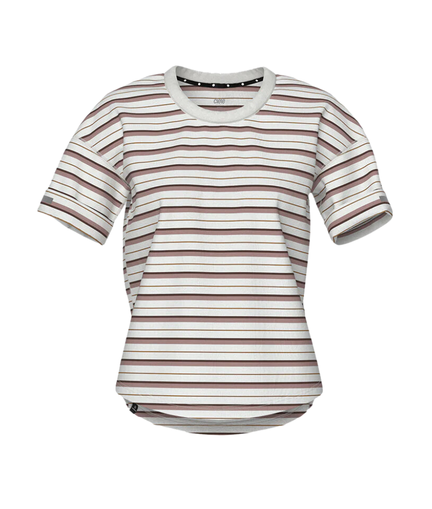 a classic striped T, yarn dyed for quality and styled to perfection while using the comfort and cooling effect of GRS recycled cotton, in combination with GRS recycled polyester to bring you a moisture wicking, quick drying run ready t-shirt. We've added concealable reflective details, for that unplanned night run home, flatlock stitching for comfort, and an all natural antimicrobial to defend against unwanted odors and harmful microbes that plague your everyday activewear. The water based print is designed with breathability in mind, so it won’t get wet and sticky and uncomfortable like most printed t’s do during a run. This is the Ciele athletics women’s not so basic t-shirt. wear it every day but race day. WNSBTShirt – Ringwald Stripe.