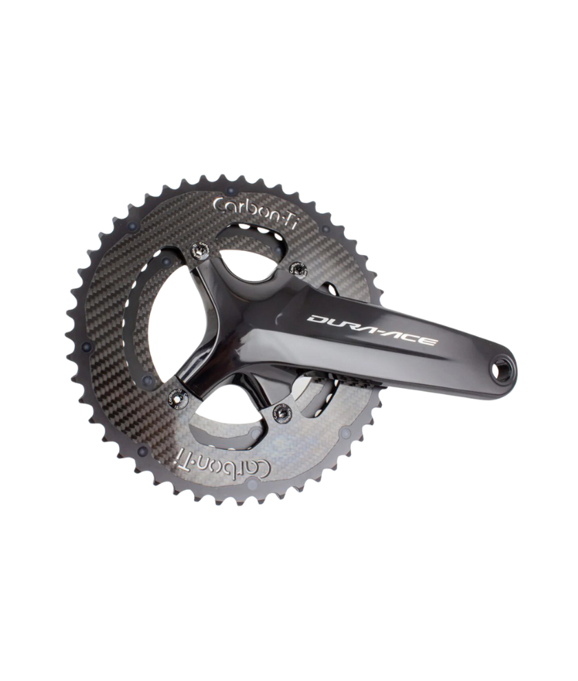 Carbon-Ti chainring X-CarboRing 50 x 110 DA9100 (4 arms), crown in Al7075-T6 aluminum alloy, structural carbon fiber with polished 3K finish and Grade 5 Titanium pin. 50 teeth external gear and bolt round (BCD ) 110 mm 4 arms. Compatibility with Shimano Dura Ace FC-9100, Ultegra FC-8000 or SRM Origin 9100 cranks and Shimano, SRAM and Campagnolo 10-11 speed groupsets.