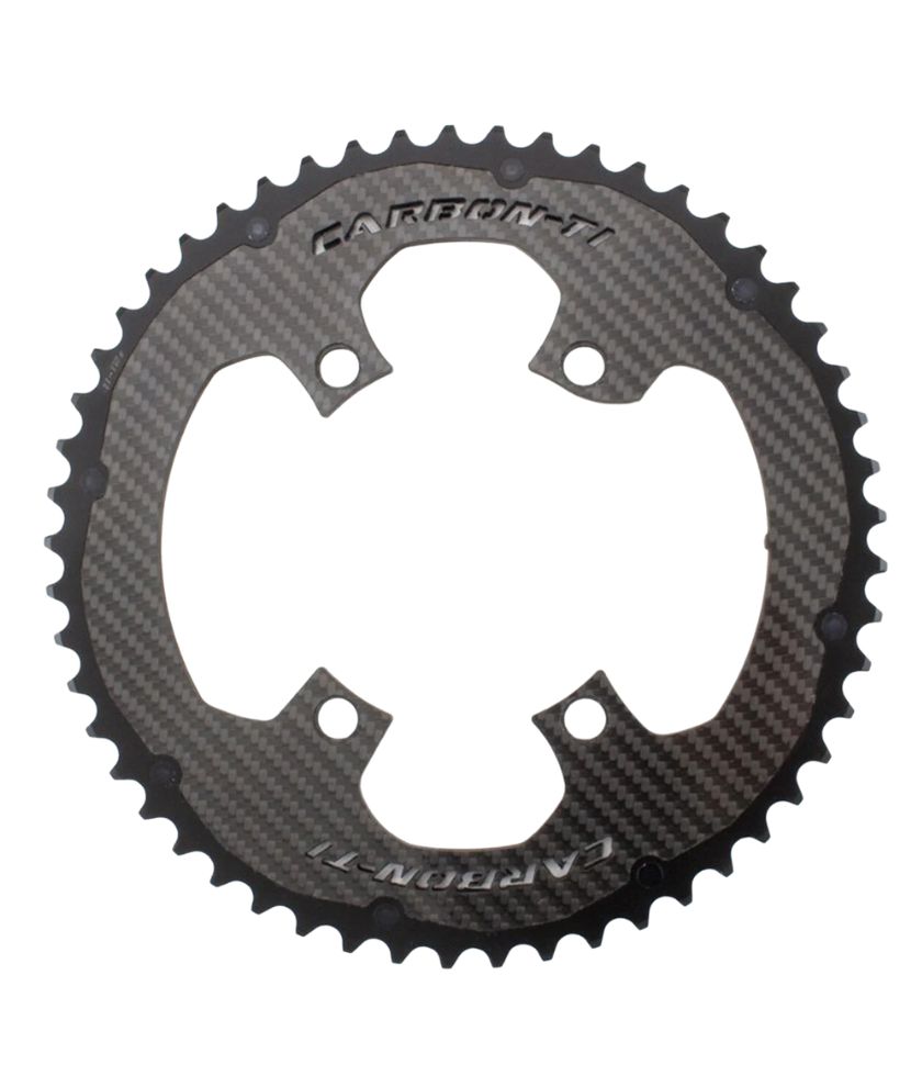 Carbon-Ti chainring X-CarboRing 52 x 110 DA9100 (4 arms), crown in Al7075-T6 aluminum alloy, structural carbon fiber with polished 3K finish and Grade 5 Titanium pin. 52 teeth external gear and bolt round (BCD ) 110 mm 4 arms. Compatibility with Shimano Dura Ace FC-9100, Ultegra FC-8000 or SRM Origin 9100 cranks and Shimano, SRAM and Campagnolo 10-11 speed groupsets.
