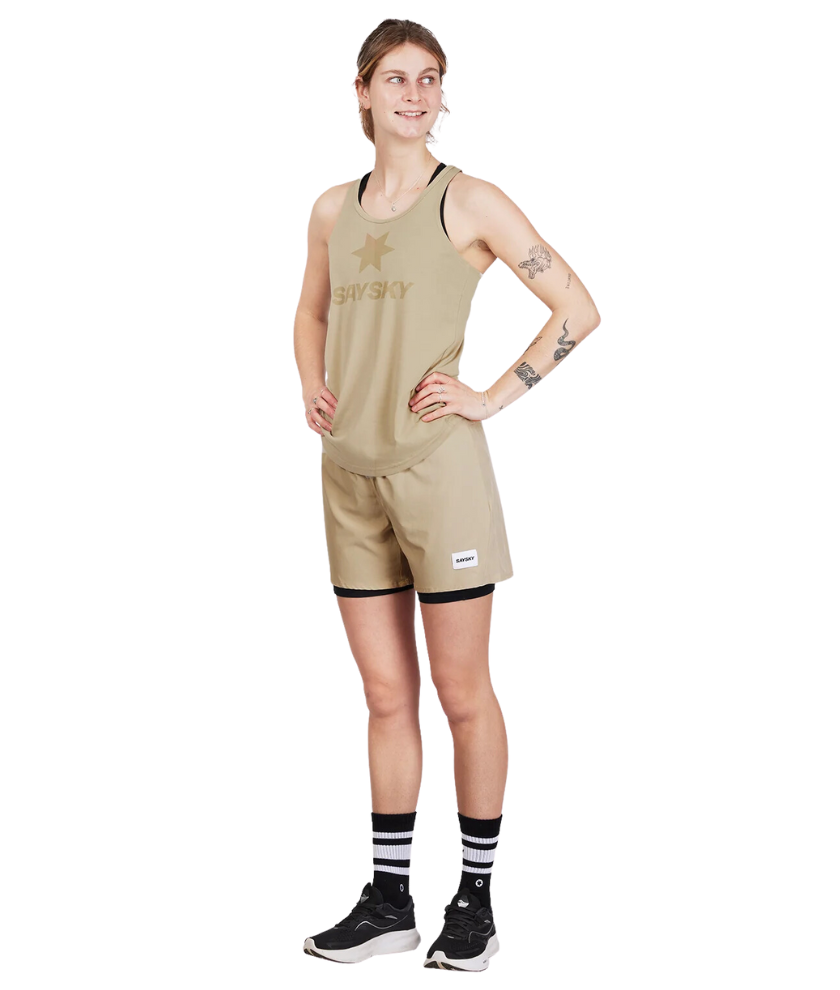 The SAYSKY Logo Motion Singlet is a singlet for women from our Motion series. It is made in soft Tencel mixed with polyester, resulting in a very comfortable performance product. It comes in beige with a classic SAYSKY logo on the chest and a woven label on the back. The singlet has a casual fit and a light feel, which is perfect for workouts, running and everyday wear.
